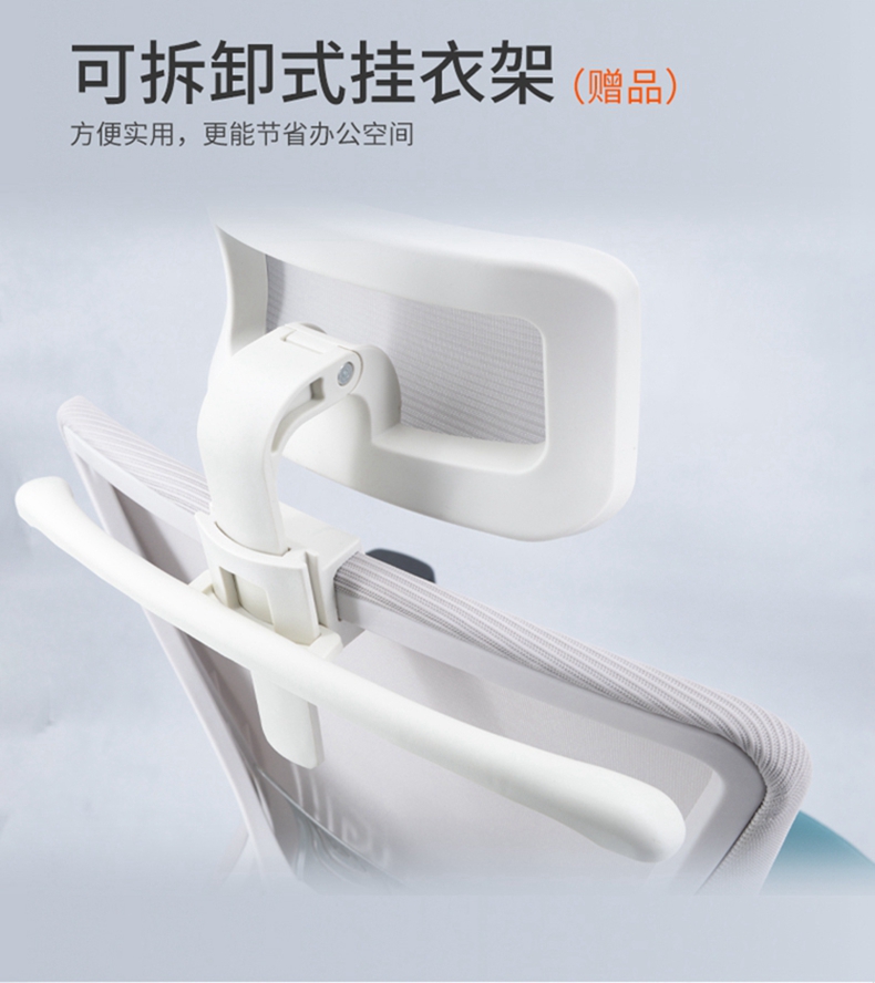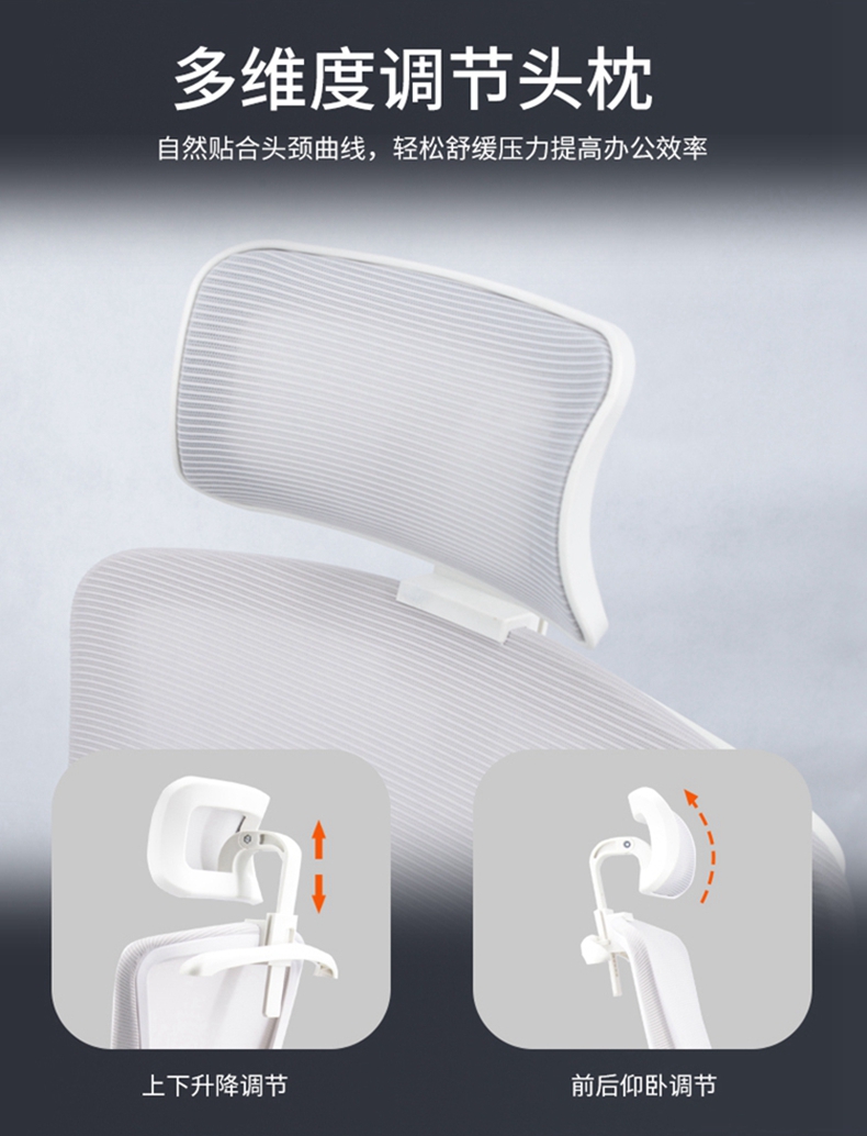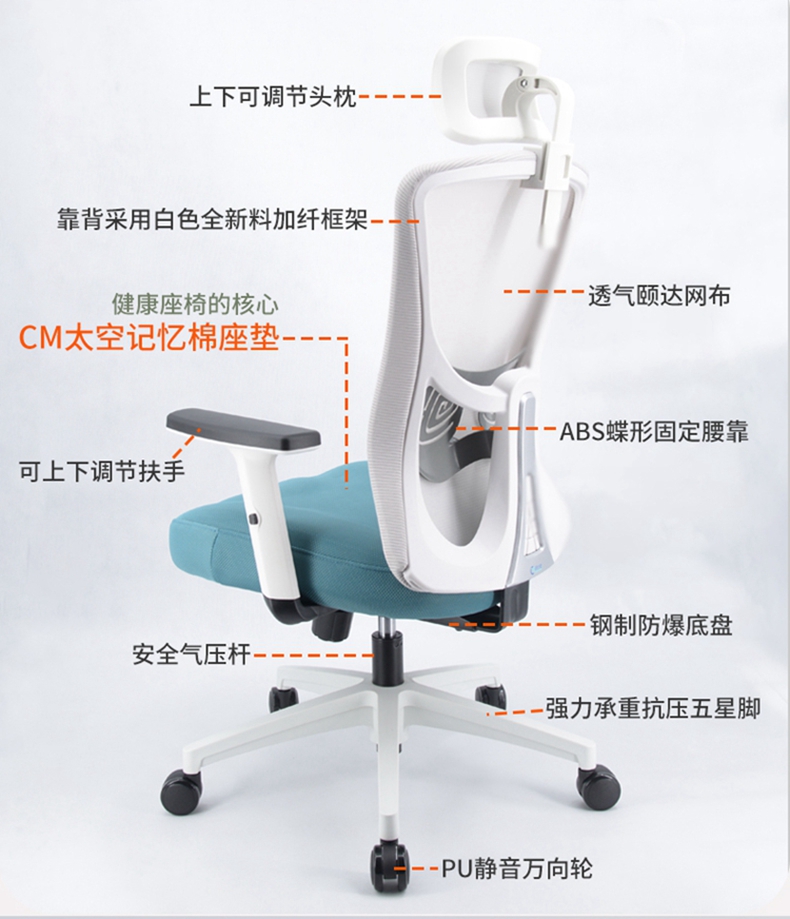 靠背采用白色全新料加纤框架,活动头枕和软质固定腰靠,透气网布;