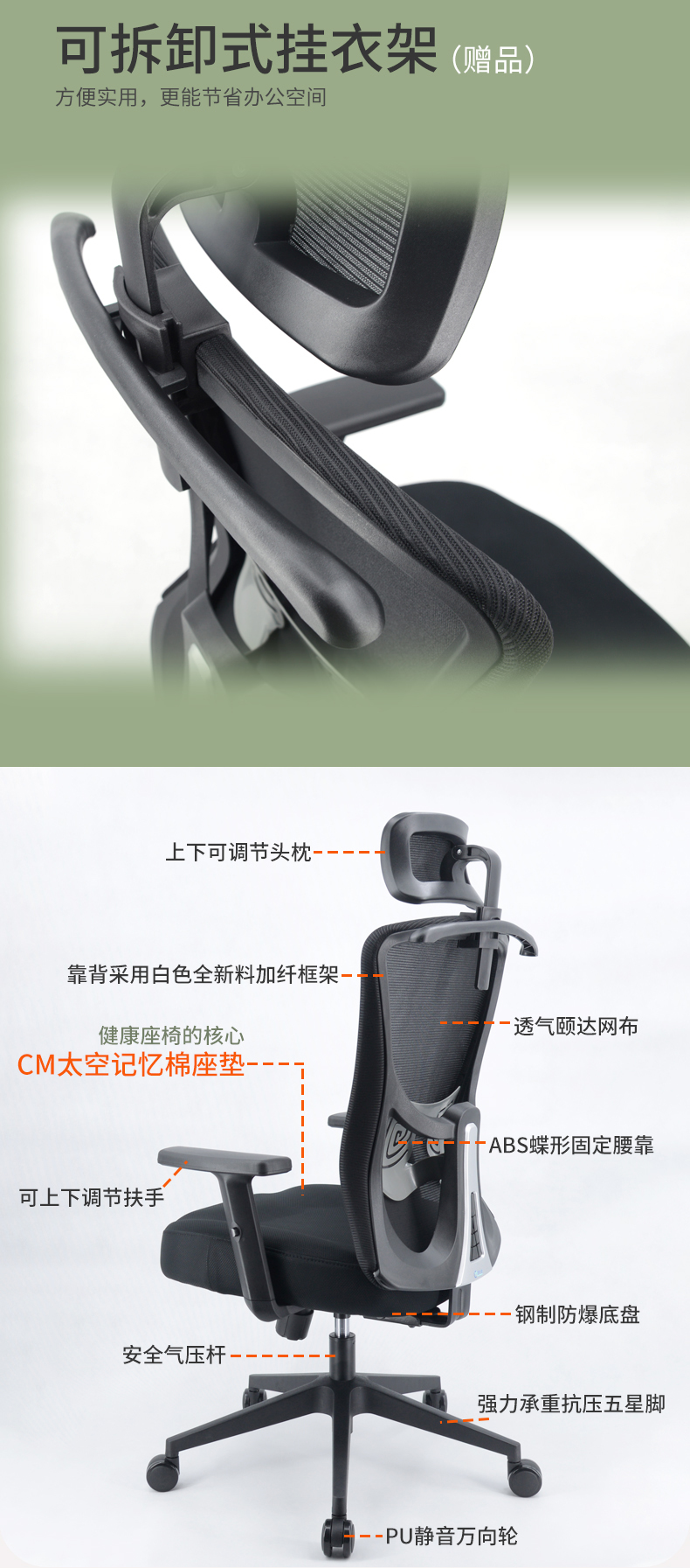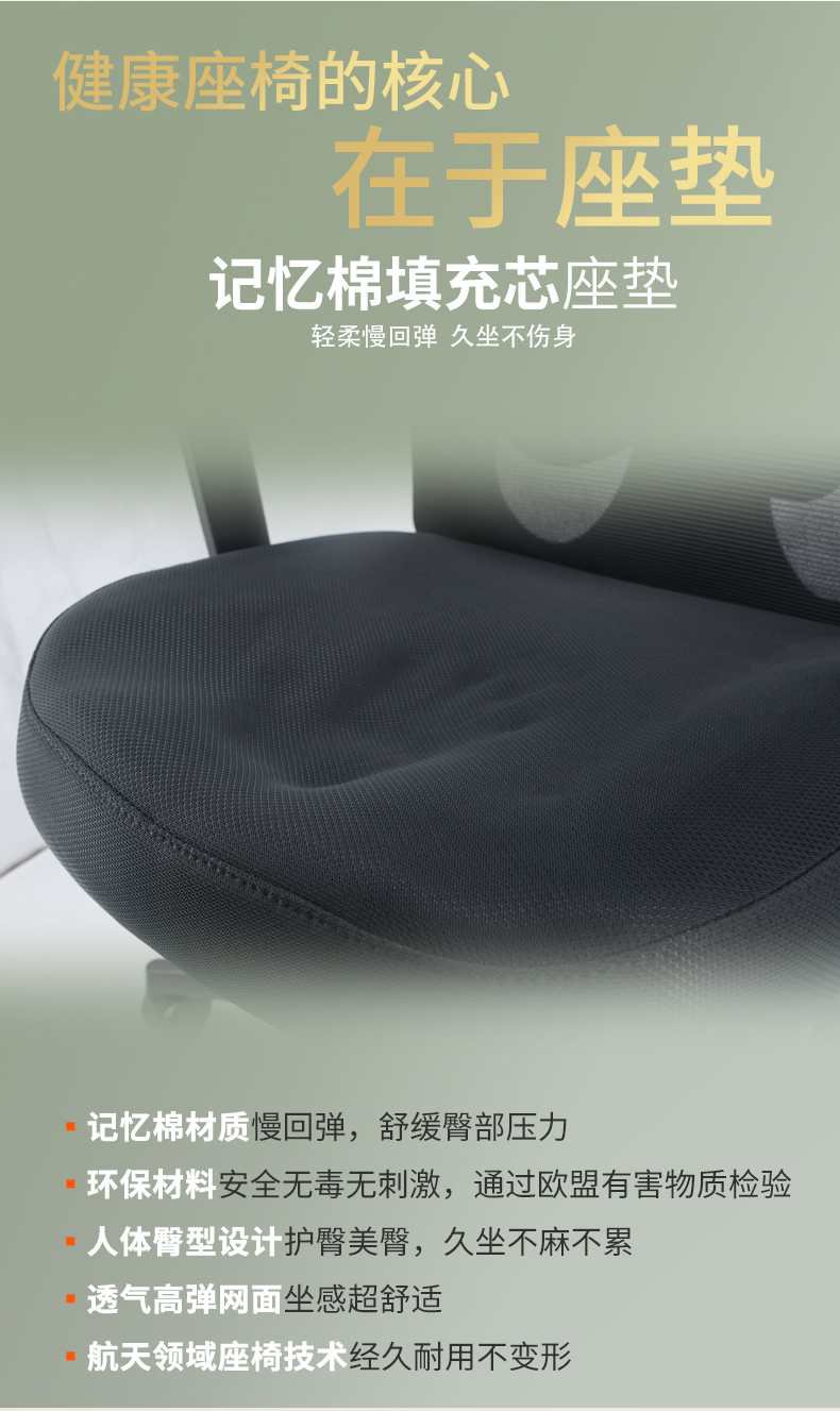 座垫采用一体成型太空记忆棉+45高密度海绵,透气网布;